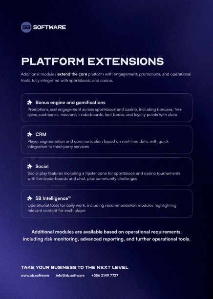Additional modules extend the core platform with engagement, promotions, and operational tools, fully integrated with sportsbook, and casino.